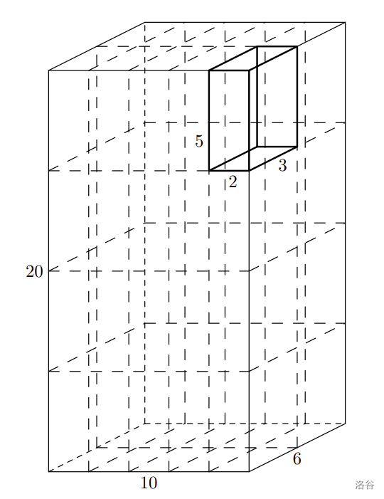 Output three integers , , , the number of cuts to be made along each of the dimensions , , and , respectively, if it is possible to cut the cake, or a single integer otherwise. Note that making zero cuts along a dimension is allowed, too.