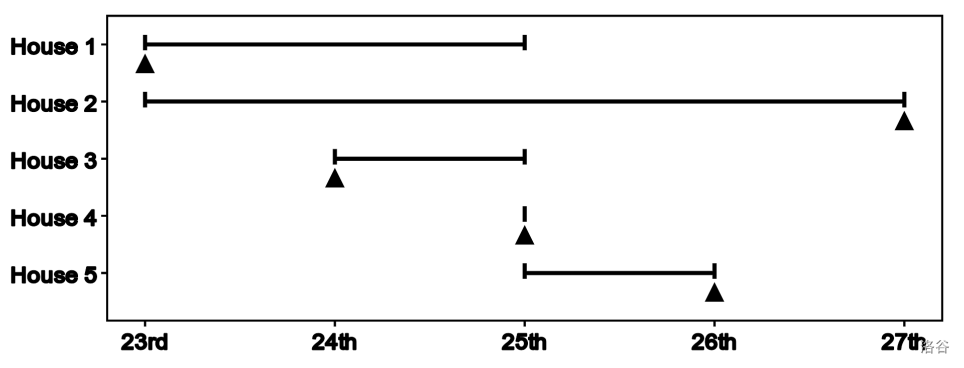 The first sample is depicted in the figure below. Santa can leave the presents during the periods shown as horizontal lines with short vertical markers at both ends. For the House 4, Santa can visit only on a specific day. The triangles show the days on which Santa should visit each house.