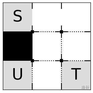 $$\begin{aligned} &n\ m \\ &s_1 \\ &\vdots \\ &s_n \\ &k \\ &r_1\ c_1\ d_1 \\ &\vdots \\ &r_k\ c_k\ d_k \\ \end{aligned}$$ and are integers between and , inclusive, representing that the building floor has rows and columns of sections. The section in the -th column of the -th row is identified as section . The -th line of the following lines has a string of length describing the sections in the -th row. Each character of is one of . , #, S, T, and U. If the -th character of is #, section is blocked and is impassable; otherwise, the section is passable. The -th character of being S means that section is the entrance section, T means the top-secret section, and U means the entry point of the trespassers, that is, the section with a fragile window. Each of S, T, and U occurs exactly once in the input as an outermost section. The top-secret section is reachable from the entrance through passable sections with no shutters closed.