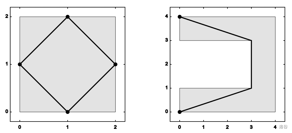 The island is modeled as a polygon on a two-dimensional plane. The polygon is simple, that is, its vertices are distinct and no two edges intersect or touch, other than consecutive edges which touch at their common vertex. In addition, no two consecutive edges are collinear. Each port in the island is modeled as a point on the boundary of the polygon. Your route is modeled as a closed curve that does not go outside of the polygon.