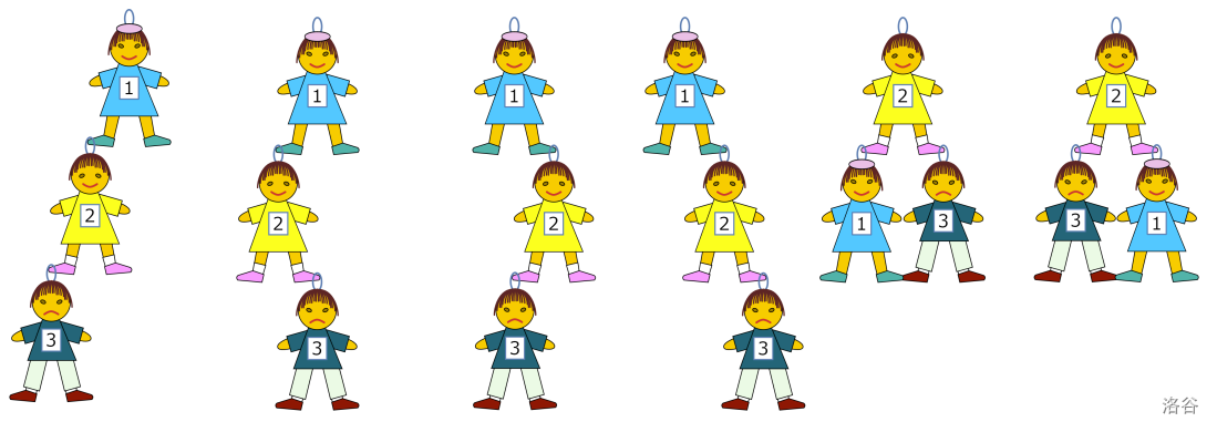 Figure G.1. Trees satisfying the rules for Sample Input 1. The numbers on the puppets represent the release order. :::