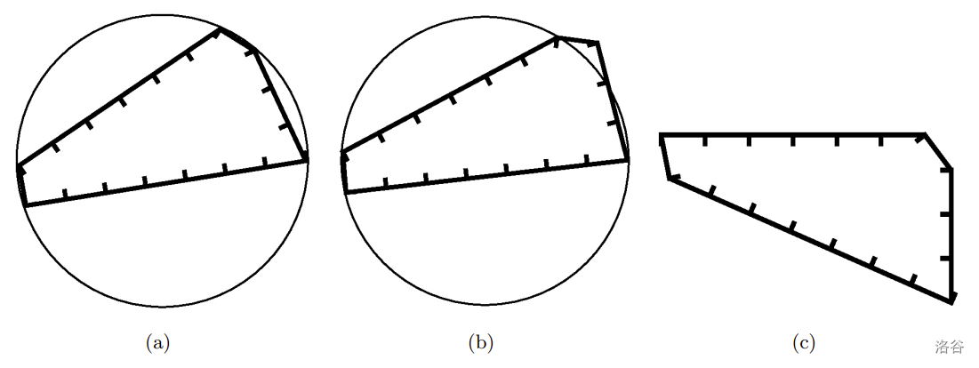 Figure E.2. (a) A pentagon with a circumscribed circle; (b) A pentagon with no circumscribed circle; (c) Another pentagon with no circumscribed circle :::