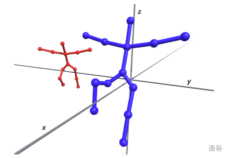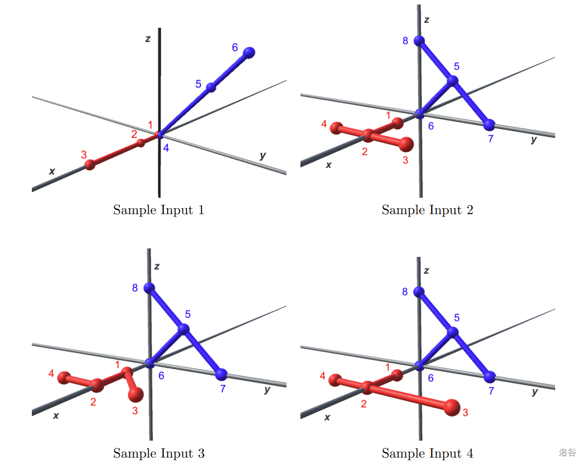 For the sample input 1, each node of the red tree is mapped to the corresponding node of the blue tree by the transformation that translates , rotates around the -axis, rotates around the -axis, and finally scales by . By this mapping, nodes , , and of the red tree at , , and correspond to nodes , , and of the blue tree at , , and , respectively. This is the only possible correspondence of the twin trees.