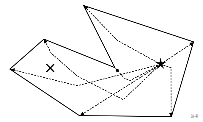 In the following figure, the outer polygon represents a coastline. The point is fun, while the point is not fun. Dotted polylines starting from are valid spiral paths that end at coastline vertices.