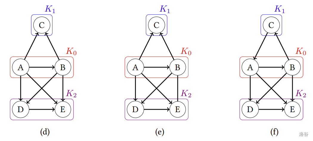舉例來說,圖(d)就是一份符合要求的完整勝負關係,最終贏家為 C 和 E。圖(e)中的 B、E 有建立關係但沒有分出勝負,所以它不是一份完整的勝負關係。而圖(f)則是因為 A 比 C 強、C 比 B 強、但 B 又比 A 強,所以它沒辦法決定出最終贏家。