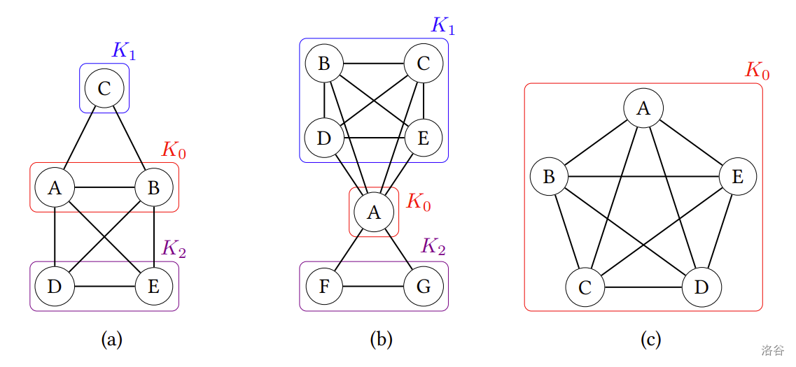 舉例來說,圖(a)上有一個中心圈圈 ,兩個小圈圈 、,、、。假設中心圈圈的參賽者為 ,小圈圈的參賽者依序為 、,可以看到位於中心圈圈 的參賽者和所有參賽者都有建立關係,相同小圈圈內的參賽者都有相互建立關係,並且對於分屬不同小圈圈 、 的任兩位參賽者而言,都沒有建立關係。圖(b)、(c)也是同樣正確的範例。