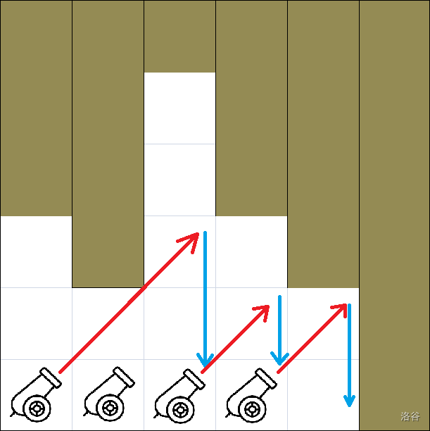 在除最后一段外的每一段路上,他都放置了一门高度为 的大炮。每一门炮都向上倾斜 度角。然后,哥萨克胡子坐进第一门炮并开火。他沿着 度角向前飞行,直到撞上钟乳石。接着,他垂直下落。请注意,即使哥萨克触碰到钟乳石的角(图中第二段路),他也会继续飞过去,即不会下落。假设他落在了第 段路上。如果 是最后一段路(即 ),那么他的娱乐活动就此结束。否则,他会跳入第 段路上的大炮,再次把自己发射出去。这个过程重复进行,直到哥萨克到达第 段路为止。