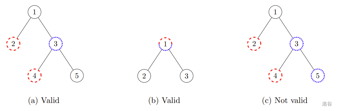 The figure below shows sponsored stations in red/dashed circles and businesses in blue/dotted circles. The set of proposals in (a) is valid because the business proposal for station 3 is located exactly on the path between the two sponsored stations 2 and 4. The set of proposals in (b) is also valid, because the business proposal for station 1 is located exactly on a sponsored station. On the contrary, the set of proposals in (c) is not valid: even though the business proposal for station 3 is located on a path between two sponsored stations, the business proposal for station 5 is not.