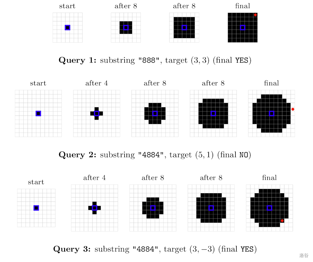 You have to answer queries. In each query, you start with an infinite grid where only the bonus level is unlocked, and you are given four integers . You have to determine whether the bonus level is unlocked after getting the scores in the substring of .