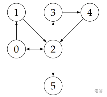 The graph corresponding to this example is depicted on the right. For the same reason as in Sample 1, the node does not belong to while does. The nodes and do not belong to because we do not have edges or . Finally belongs to because all paths from to use the edge .