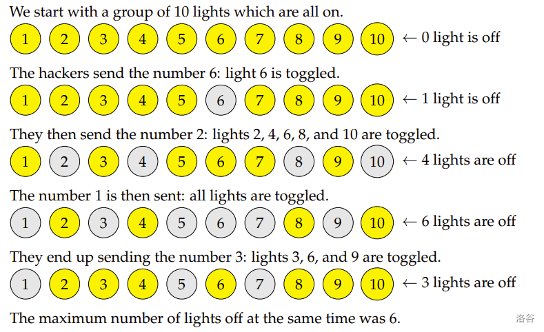 Those public lights in Paris are numbered from to and are all on by default. A group of hackers has gained the capability to toggle groups of lights. Every time the hackers use their program, they cause a number (that they cannot control) to be sent to the system controlling the city lights. The lights numbered , , , and so on (up to ) then change state instantly: lights that were on go off, and lights that were off go on.