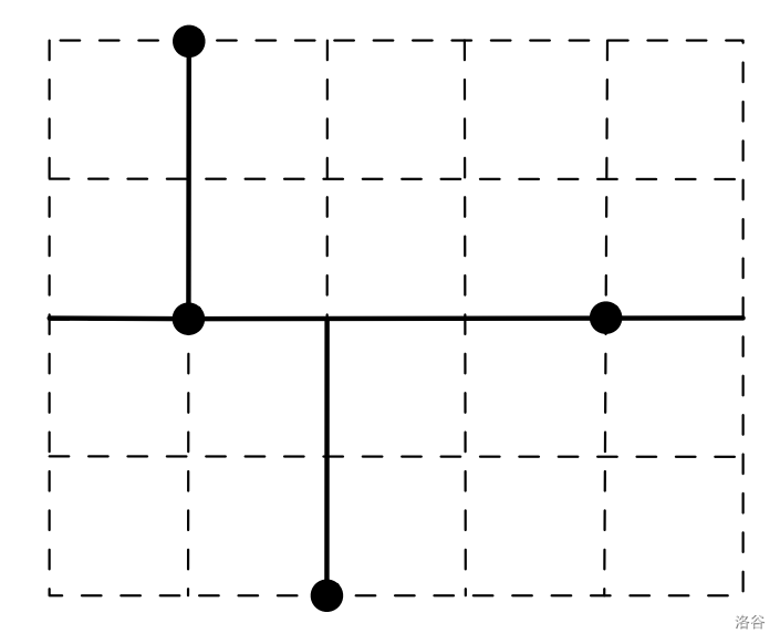 A tour in a grid city might look like the figure above. On the figure, the bus enters the city at coordinate (we consider to be the northwest corner of the city), first visits the monument at (already on the main road), takes a left turn and visits the monument at , returns to the main road and moves east, takes a right turn and visits the monument at , returns to the main road, visits the monument at (again on the main road), and then exits the city at coordinate .