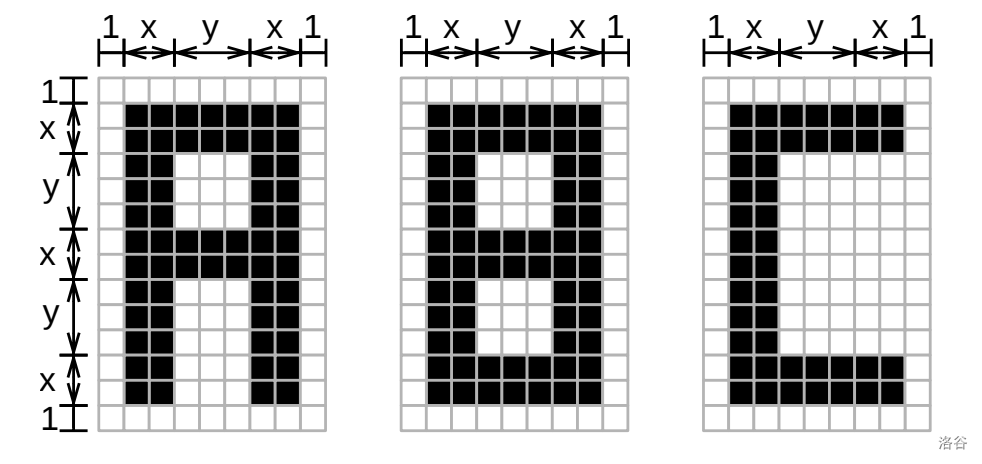 - All marks have one of the following shape with and being arbitrary strictly positive integers, and possibly different for each mark. Note that marks are surrounded by white pixels, and that marks cannot be rotated.
