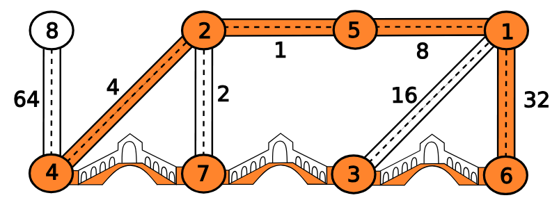 为了逃离圣诞集市的喧嚣,你计划前往威尼斯旅行,欣赏其美丽的运河与众多桥梁。不幸的是,似乎并非只有你一人有此打算,而且威尼斯最近决定为此乐趣收费。因此,你认为每座桥只经过一次就已足够。幸运的是,仅通过街道(不经过任何桥梁)即可从任一地点到达任何其他地点。有趣的是,仅使用街道前往任何其他地点恰好只有一条路径。