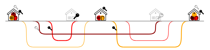 图 J.1:样例输入 的示意图,有 个 DOMjudge 团队成员, 把钥匙,总共 次旅行。携带钥匙的旅行用粗体显示。有两次,一个人回到空房子,必须使用自己的钥匙开门。