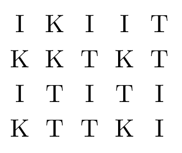 对于今年的 NWERC,我们想创建一个 “Find the Fox” 的简化版本。因此,你在这个问题中的目标是创建一个具有给定尺寸的字谜网格,并包含给定次数的字母 ‘K’、‘I’ 和 ‘T’。与原书类似,这个网格应该恰好包含一次单词 “KIT”。