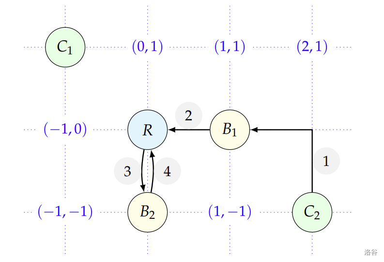 On this example, only one courier () is used to retrieve the two bottles and , and bring them to the restaurant by performing the moves labeled 1 to 4 in succession. The total number of kilometers is 5. This is one of the optimal solutions.