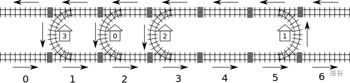 在这个铁路系统中共有 个车站,它们分别以数字 到 为编号。这里假设我们可以由任何一个车站出发、沿着路轨的方向到达任何其他车站。例如我们可以由车站 到达车站 ,所经路线是由区段 开始,经区段 及区段 的南面路轨,然后经由区段 通过车站 ,再经区段 的北面路轨,最后到达区段 并由北面路轨进入车站 。