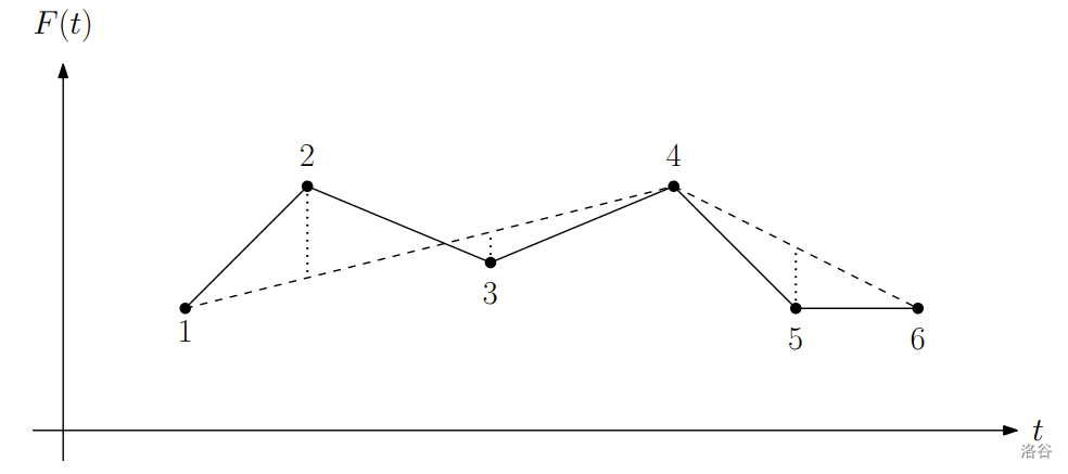 Let be defined over a strictly increasing sequence of days, and be defined over a subsequence of , where , , and for . (We call the size of .) The error of is defined as the maximum of for all . For example, in the following figure, we have data points, labeled through , whose coordinates are the same as those presented in the second sample input, and is a simplification of of size with data points , and . In this figure, is depicted by solid lines, and by dashed lines. The error measure for is realized by the vertical distance of point to .