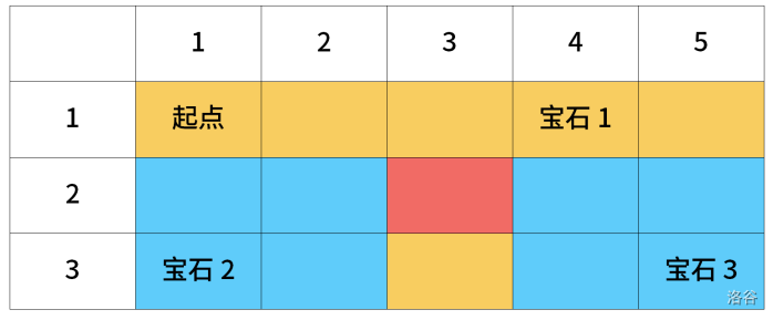 Maddy 从一个给定的子地块 出发,她需要在这一区域收集至少 块宝石。她的行动需要消耗精力值,行动和精力值的计算规则如下: