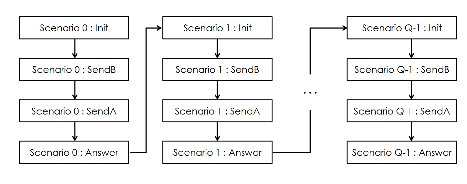 对每个场景,依次调用 Init、SendB、SendA、Answer。你的程序应在这些调用中使用合法参数并返回合法值。调用顺序如下: